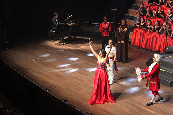 Silencio, un miembro del coro empieza a cantar en quechua, aplausos irrumpen en el teatro, un redoble sigue, entra el coro y cantan Hanac Pachap, Mozart no entiende el idioma, la joven música le cuenta que es quechua, idioma de su país, es además la primera obra polifónica escrita en América por Juan Pérez Bocanegra. También le cuenta que hubo otros compositores después que él como Georges Bizet. En eso entra a escena Bettina Victorero como Carmen y Mozart queda deslumbrado por su belleza, canto y presencia. Ella se luce con una Habanera que deja boquiabierto a Mozart. El coro la acompaña transportando al teatro hasta Sevilla. Luego la joven música le entrega la partitura de Nessun Dorma a la directora pero el monje le pide permiso para cantarla, ella accede. El coro acompaña ahora al monje transportando al teatro a la antigua China, el ambiente cambia y el teatro disfruta de la gran interpretación del monje Juan Antonio.