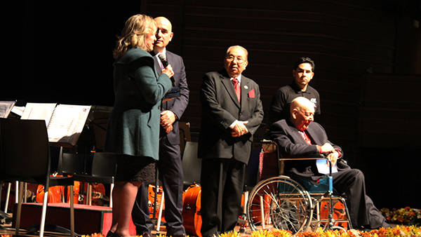 La segunda parte del concierto empezó con una ceremonia de reconocimiento. Primero entró al escenario Enrique Bernales quien se dirigió al público: “Con Miguel nos ha unido siempre el amor a la música, quisiera contarles tantas anécdotas de Miguel de las que soy testigo, sin embargo se me ocurre pensar que él es una especie de personaje que viene del siglo XV, del siglo XVI, un hombre del Renacimiento, una mezcla de Vivaldi y de Quijote, de Vivaldi por esa entrega y dedicación a la música y de Quijote porque en él ningún sueño es un imposible. Todos los ha realizado en medio de mil vicisitudes, en un país donde es tan difícil hacer música. Miguel es un triunfador. Lo he acompañado prácticamente en todos los centros culturales de Lima. Esa mezcla de Vivaldi y Quijote lo llevó a este bello programa donde estos niños hablan por él y por todo lo que él ha hecho. Viaja por todo el Perú para crear los núcleos musicales de tal manera que esta orquesta tenga una perpetua y constante renovación. Un esfuerzo ciertamente maravilloso, un esfuerzo que solamente lo puede hacer una persona que tiene dos inmensas virtudes: la perseverancia que le da la fe en lo que él cree que es la música, y, como él me dijo una vez, para mí la música no es escucharla, la música es compartirla”.
