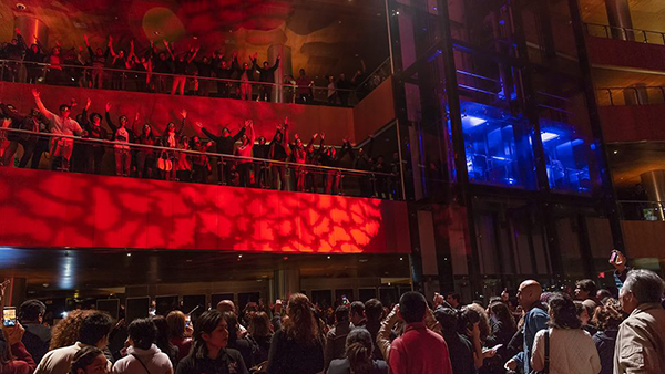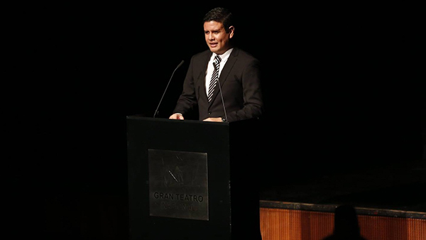 Antes de la función, hizo uso de la palabra Mauricio Salas, programador del Gran Teatro Nacional: “Estamos reunidos para festejar que tenemos un espacio escénico maravilloso, una casa para el arte y la cultura a nivel internacional, un espacio para disfrutar de nuestras expresiones artísticas, estamos más que orgullosos de poder recibirlos en esta casa de todos. Quería compartir una anécdota, con el equipo del teatro recordábamos el año 2012 con la ópera Akas Käs y personalmente me gusta recordar un momento previo, un año antes, en el mes de julio, en la preinauguración de este espacio, tuvimos la suerte de escuchar a la Orquesta Sinfónica bajo la dirección del maestro Miguel Harth-Bedoya. Era la primera vez que la Orquesta Sinfónica se instalaba en el escenario de nuestro espacio y en vez de público teníamos a 120 obreros dando los últimos detalles preparando todo para recibir al público, y el maestro Miguel Harth-Bedoya tuvo un gran gesto: llamó a todos los obreros que estaban en los diferentes pisos y los convocó a escuchar las primeras notas musicales que se interpretarían en este teatro y se las dedicó porque eran ellos los que nos iban a permitir a todos los peruanos estar reunidos de ahí y en adelante para escuchar y para ver. Y las primeras notas fueron las de nuestro Himno Nacional, un momento imborrable en mi mente y en mi corazón, porque me dejó muy en claro cuál era el verdadero sentido de este espacio: no solo es una plataforma para el arte y para la promoción de nuestras manifestaciones artísticas, es también un espacio simbólico, que nos convoca como país, un espacio de encuentro que nos permite reflexionar, pensar y mirarnos como sociedad.”