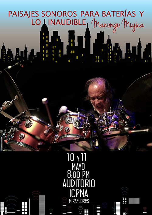 El destacado músico, percusionista y compositor Manongo Mujica, volverá a sorprendernos está vez con un nuevo concierto dedicado a la Batería como instrumento musical central de una propuesta inédita de música experimental urbana, que ha titulado PAISAJES SONOROS PARA BATERÍAS Y LO INAUDIBLE, que se presentará en dos únicas funciones, el 10 y 11 de mayo, a las 8 pm en el ICPNA de Miraflores. En PAISAJES SONOROS PARA BATERÍAS Y O INAUDIBLE Manonogo Mujica también estará presentando el nuevo disco de esta producción, que ha sido grabado y mezclado por el Ing. de Sonido Crimson Sinclair. Las entradas para el concierto pueden adquirirse ya en la boletería del ICPNA de Miraflores. Entrada general 40 soles.